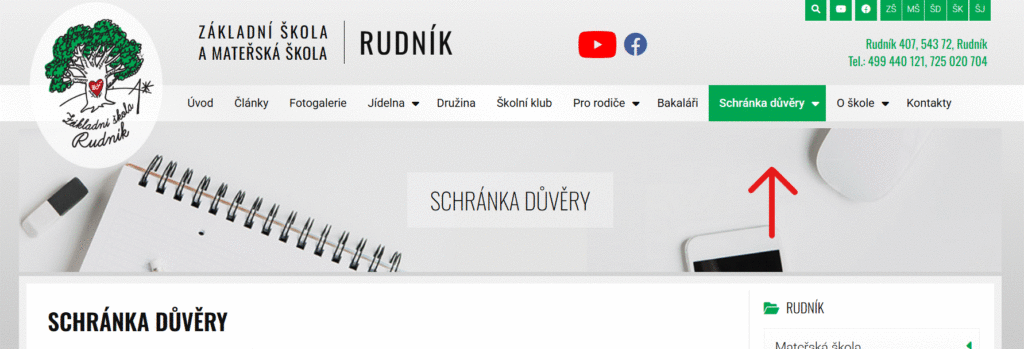 Naše škola se dlouhodobě snaží podporovat bezpečné prostředí, otevřenou komunikaci a vzájemnou důvěru. V rámci těchto snah jsme nově spustili anonymní online schránku důvěry, kterou najdete na stránkách školy na adrese: www.zsrudnik.cz/schranka-duvery